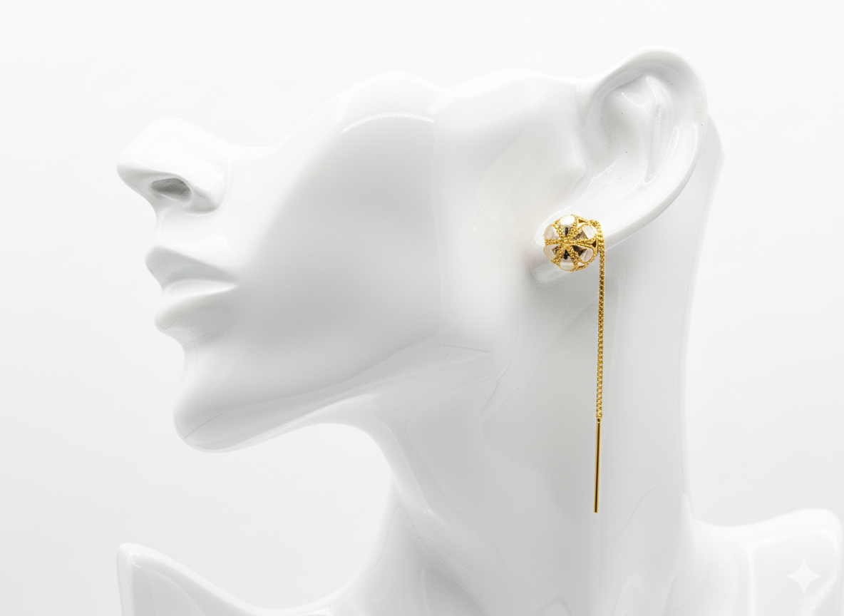 This is a beautiful Sui Dhaga earring in a classic floral design. The top features a delicate gold flower with textured petals. It has a fine, shimmering gold chain that hangs elegantly. The end has a smooth gold pin (Sui) to easily thread it through the ear. It is a lightweight design, making it very comfortable for all-day wear. The style is versatile, so you can wear it with a casual lawn suit or a formal dress. It gives a very graceful and feminine look without needing any earring backs. The polished finish has a traditional gold glow that stands out beautifully.